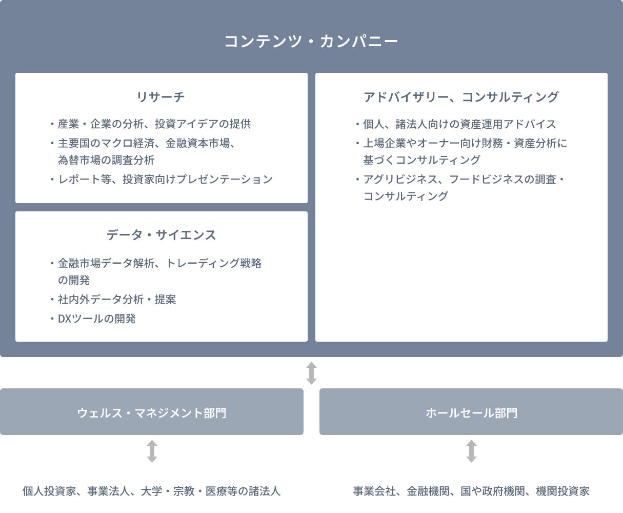 コンテンツ・カンパニーでは、リサーチ・チーム以外にも、お客様向けに様々なアドバイスやコンサルティングサービスを提供するチームを有しています。具体的には、事業会社やプライベートバンキング顧客向けの財務・経営・資産管理コンサルティング、アグリビジネスに関する調査・コンサルティングを行っています。