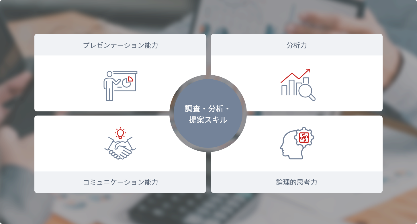 様々なデータや情報を収集・整理し、傾向や関連性、類似性を考える業務を通じて、情報を正しく理解し、考察する分析力が身につきます。