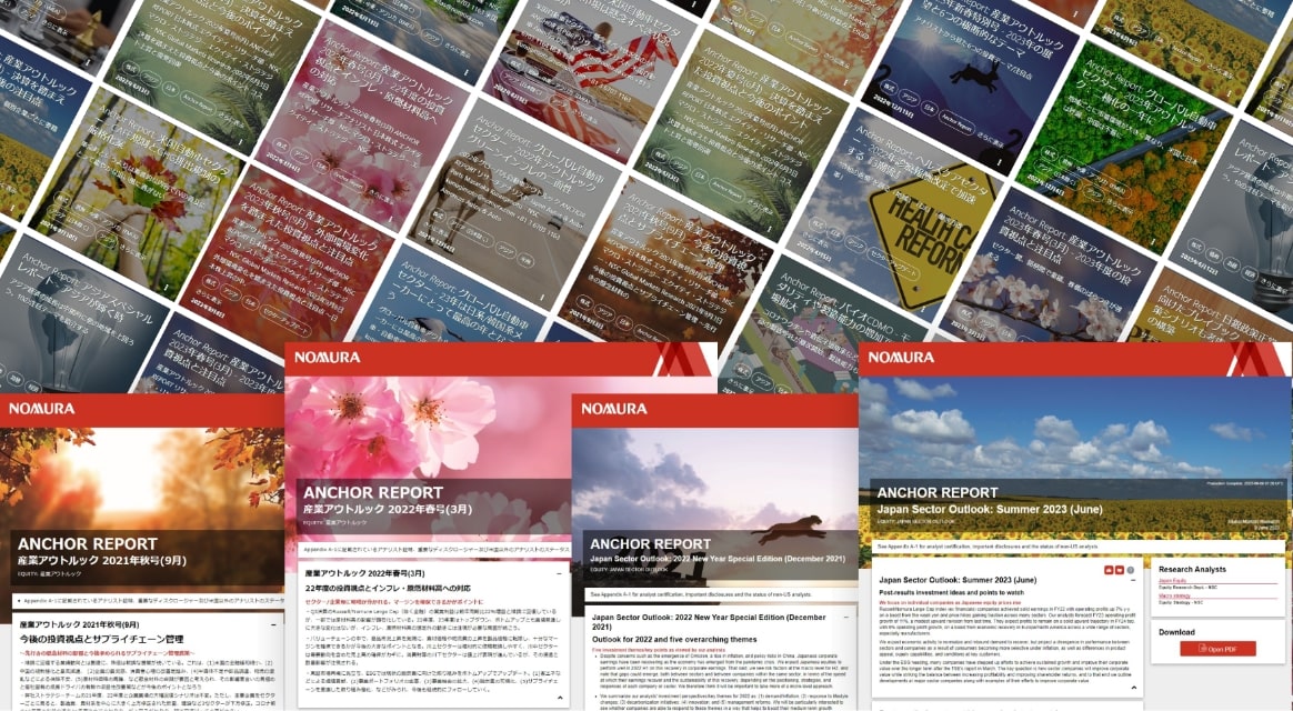 野村のリサーチ・チームは、1906年に設立された野村商店調査部が前身となっており、設立以来、調査・分析を重視する「調査の野村」の精神は現在のチームにも受け継がれています。深い分析⼒と⼤胆な先⾒性を強みとしながら、証券ビジネスの⼟台として、投資判断に役⽴つ情報提供をタイムリーに行っています。現在、約300名のリサーチャーが世界の10の地域において政治、経済、為替、⾦利、株式、クレジット、クオンツ、ストラテジー等、幅広い分野をカバーし、全世界へ投資アイディアを提供しています。またデータ・サイエンスを駆使したアプローチにも注力しています。