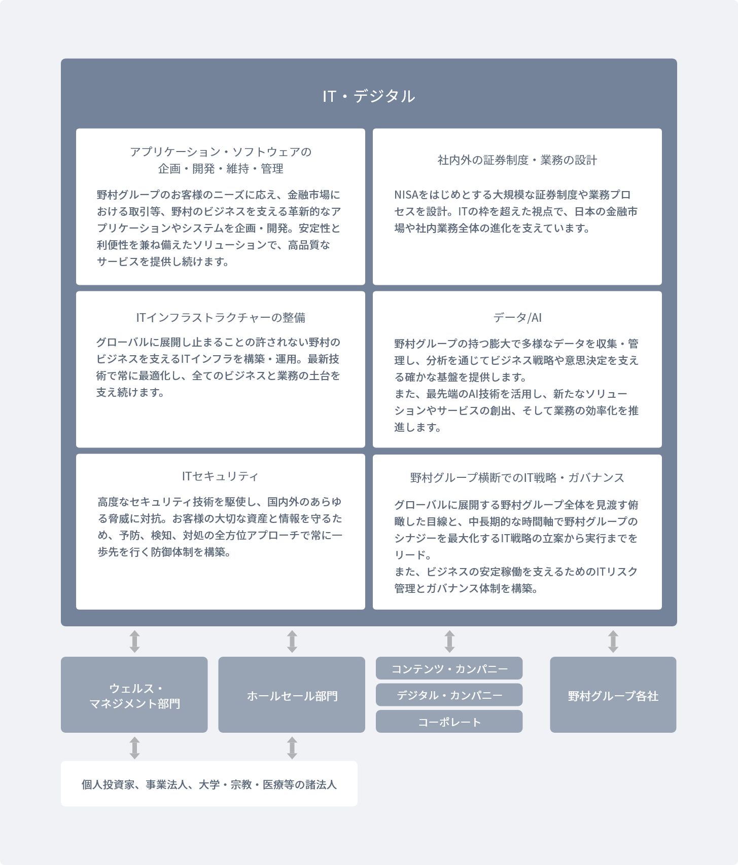 ITを介して発生する情報漏えい、データの完全性の毀損、ITシステムの停止による業務影響の防止を専門とする職種です。サイバー攻撃や不正アクセスからの防御策や社内ルール等を策定・運用し、モニタリングを行います。野村グループの大切なお客様の情報資産を守るために、常に最新の情報を把握することも重要です。