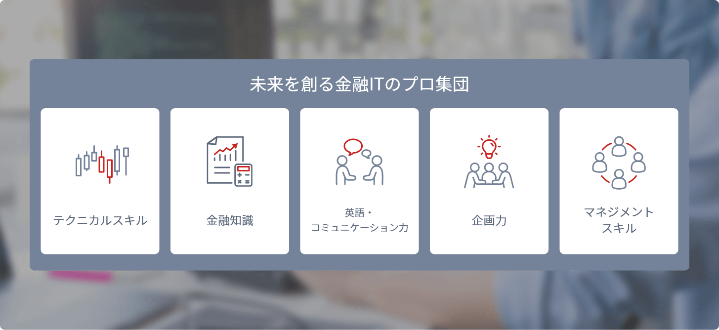 お客様の大切な資産をお預りするリーディングカンパニーとして、最先端でありつつ安心・安全なITソリューションを提供しており、高度で幅広いスキルが求められます。
