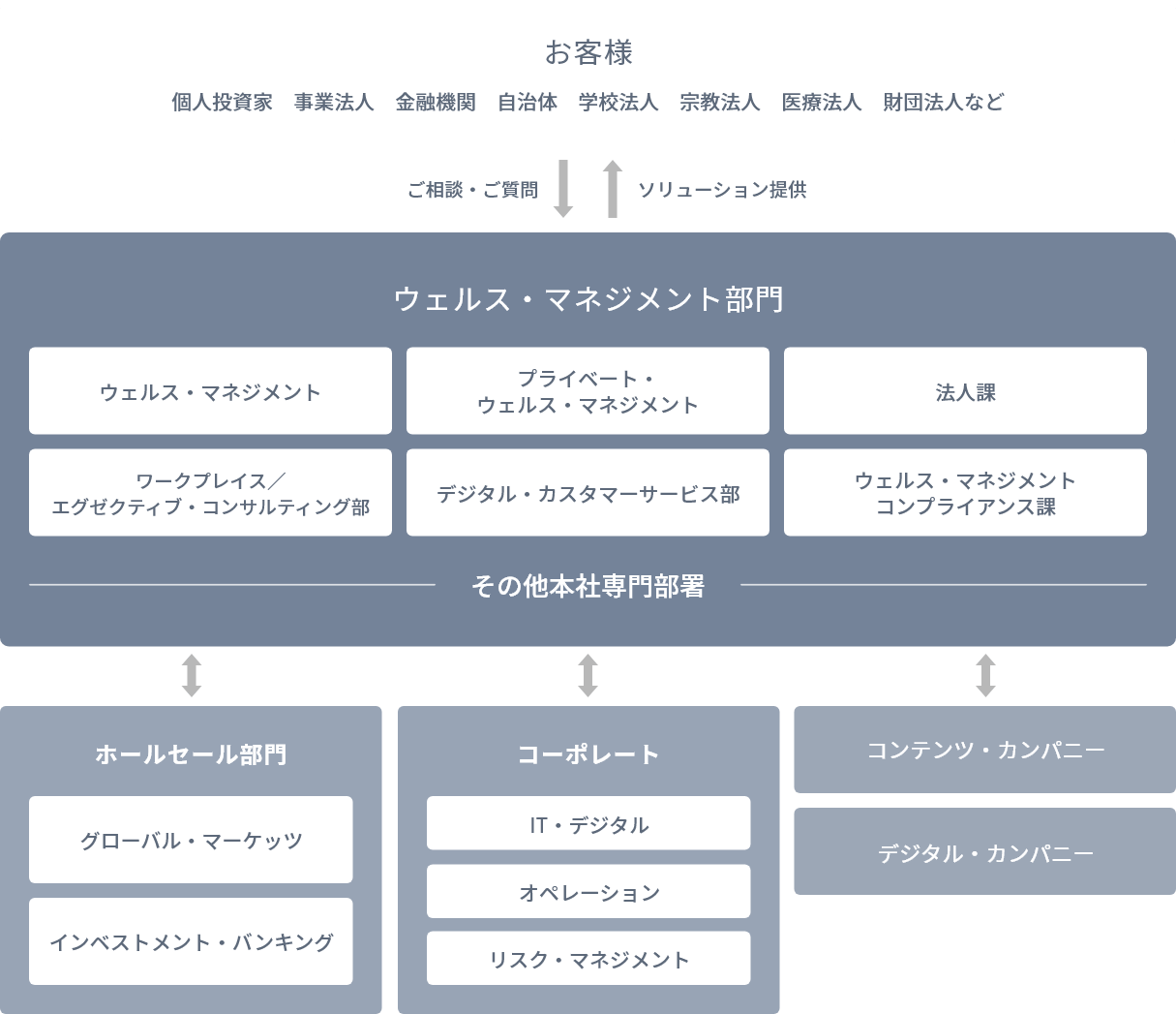 法人ソリューション部、プライベートバンキング部、ウェルス・マネジメント・ソリューション開発部、ワークプレイス・ソリューション部、確定拠出年金部、不動産業務部、商品企画部、マーケティング部など。