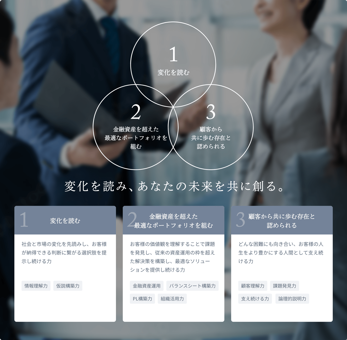 このブランドコンセプトは3つの力(スキル)に分解され、ウェルス・マネジメントビジネスを提供する上で必要なスキル、ふさわしい価値観や姿勢を身につけていくことで、業界をリードするプロフェッショナル人材へと成長していきます。